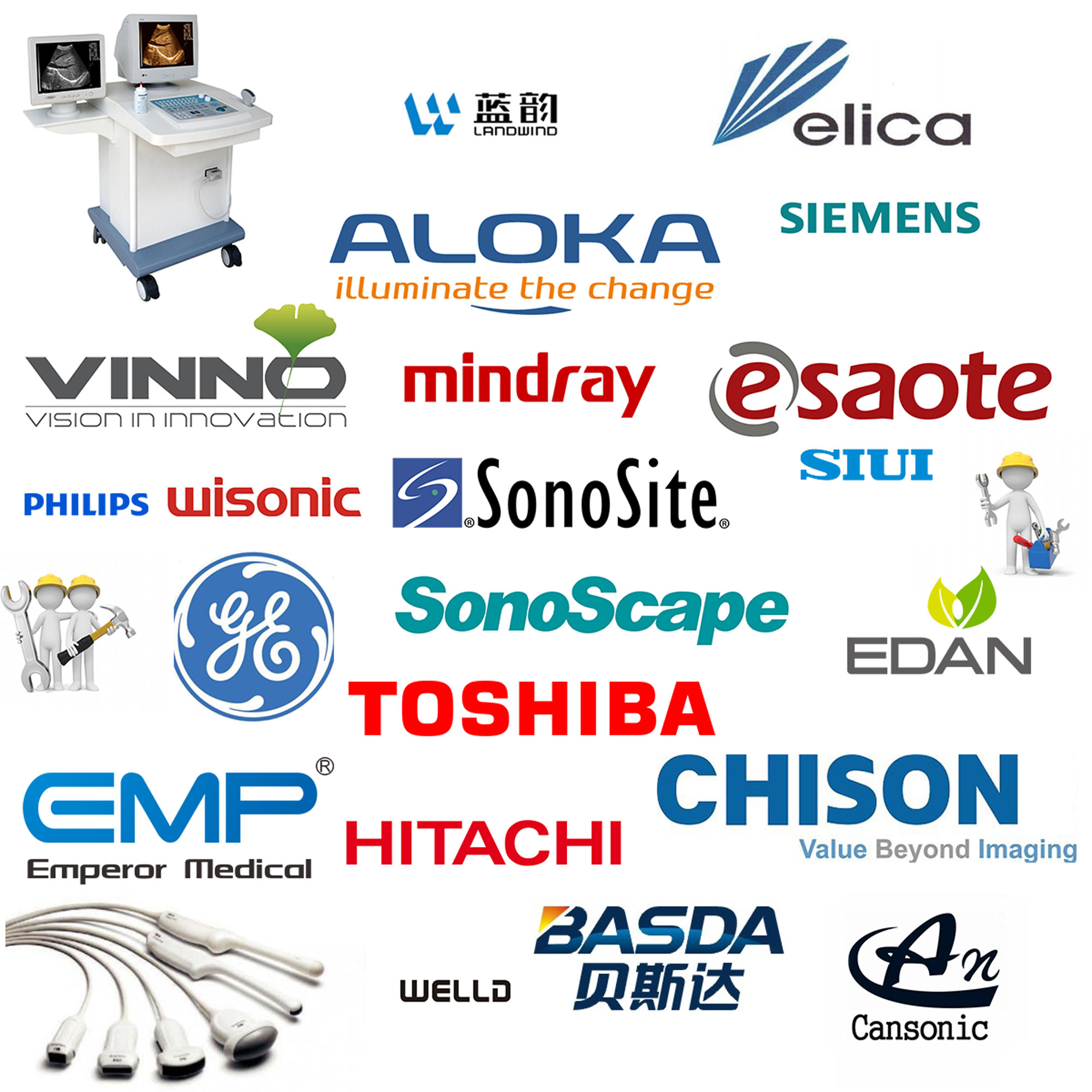 Nous fournissons un service de réparation de sondes à ultrasons pour Delica, ALOKA, VINNO, MINDRAY, Esaote, PHILIPS, Wisonic, Sonosite, Sonoscape, EDAN, GE, TOSHIBA, CHISON, HITACHI, BASDA, WELLD, Cansonic, EMP, SIAN, LANDWIND, SIEMENS, SIEMENS, LANDWIND